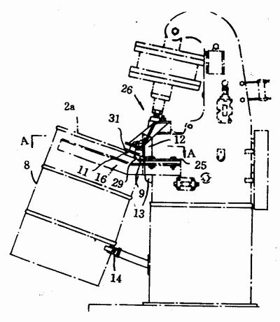 圖2是本發(fā)明的鋼桶桶口卷邊開卷裝置。圖中正在對一開口桶8的桶口卷邊進行開卷。此時,蓋3和填充劑4是沒有的。鋼桶桶口卷邊2a朝上。圖2中所示的犁形開卷器9有一個鼻狀體10(見圖3)。它的伸出高度不超過鋼桶桶口卷邊2a。導(dǎo)向輥輪11與犁形開卷器9相對府-對鋼桶桶口內(nèi)壁進行擠壓。導(dǎo)向輥輪的外圍法蘭31超過鋼桶桶口卷邊2a的上表面。