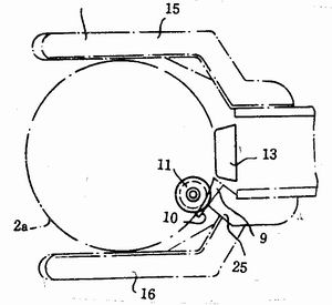 然后,輥輪12和13被同時驅(qū)動,拖動鋼桶桶口卷邊2a倚于犁形開卷器的鼻狀物10上來展開它。導(dǎo)向輥輪1也與輥輪12配合動作。輥輪12可采用氣動或液壓來推動。