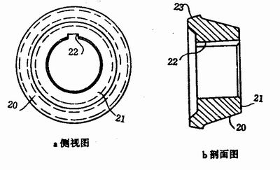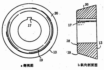 圖4說明下輥輪13通過鍵槽被固定在驅(qū)動軸上。輥輪的外表面20與它的前端面18的垂線具有15°的夾角。輥輪的前端面18與外緣轉(zhuǎn)角處倒成圓角。