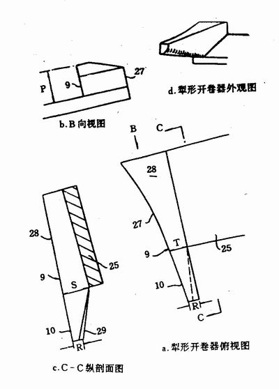 如圖6所示,犁形開卷器9固定在平板25上(見圖1)。而此平板則通過螺栓固定在圖2所示的設(shè)備的機架上。犁形開卷器9的大致,外形受囤2和6d。它具有一個與鋼桶桶身外表曲面相匹配的弧形內(nèi)表面,其曲率半徑為28.6cm。從圖6a中也可看到它的機體是斜削的,鼻狀物10的斜削始于平板25。實際上,在具體設(shè)備中,它的上表面28與平板25呈4°夾角。鼻狀物10的下部外表面29倒成圓角,當它對鋼桶桶口卷邊進行開卷動作時,與卷邊2a的端部30接觸。